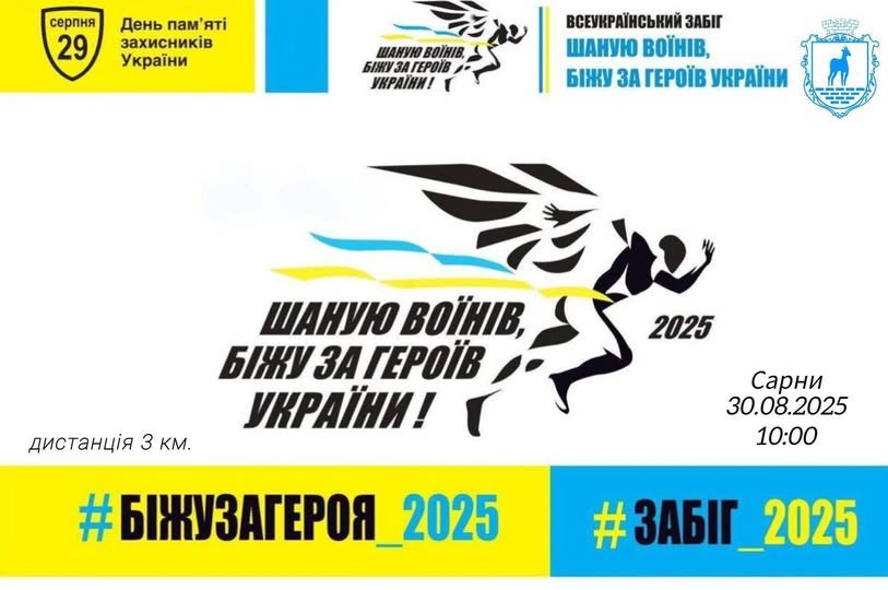 30 серпня - Сарненська міська територіальна громада приєднається до загальноукраїнського забігу памʼяті захисників, які загинули в боротьбі за незалежність, суверенітет та територіальну цілісність України.