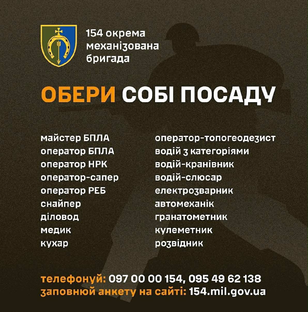 154 окрема механізована бригада запрошує на військову службу за контрактом.