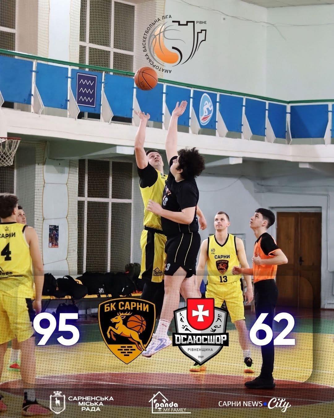 - БК «Сарни» — БК «ОСДЮСШОР» (м.Рівне) 95:62 (26-17, 18-20, 26-10, 25-15)
