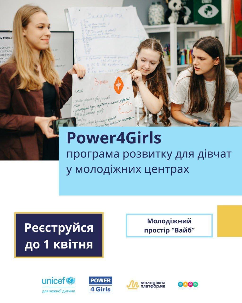 Проєкт "Power4Girl: програма розвитку дівчат у молодіжних центрах" реалізується ГО "Молодіжна платформа" за сприяння ЮНІСЕФ.