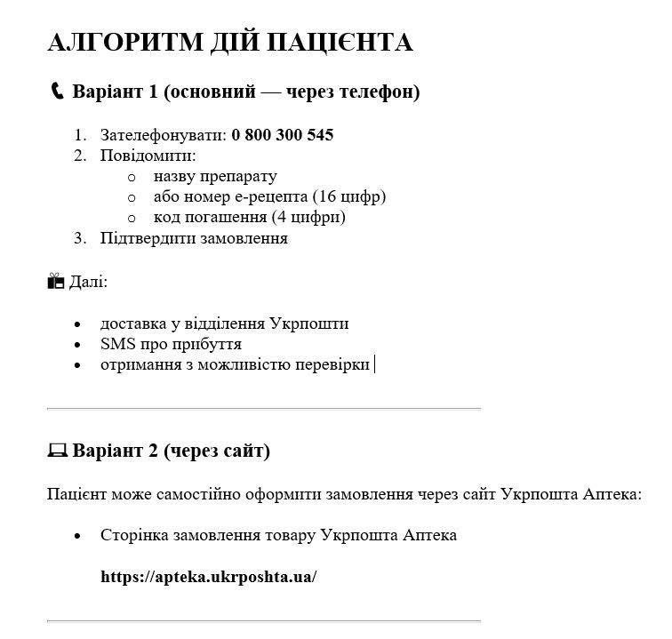 Якщо поруч немає аптеки або потрібного препарату — ви можете замовити ліки через Укрпошту з безкоштовною доставкою у ваше відділення