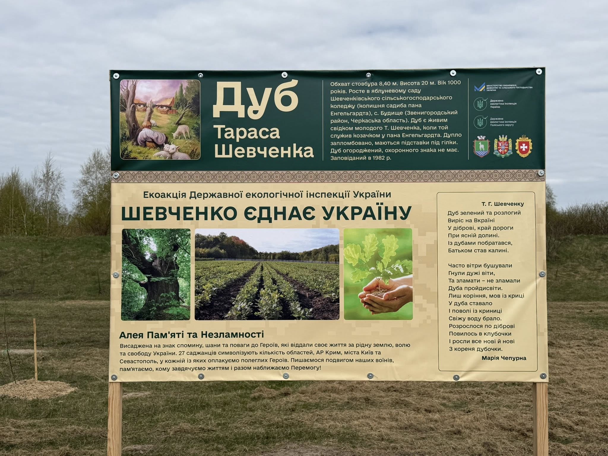 Ці дерева мають особливе походження і значення. Вони вирощені з жолудів легендарного тисячолітнього дуба на Черкащині — живого свідка дитинства Тараса Шевченка. За переказами, саме в його дуплі малий Кобзар ховав свої перші малюнки. Тож кожен висаджений дуб є не лише частиною природного середовища, а й символічним містком до історії, культури та національної ідентичності.