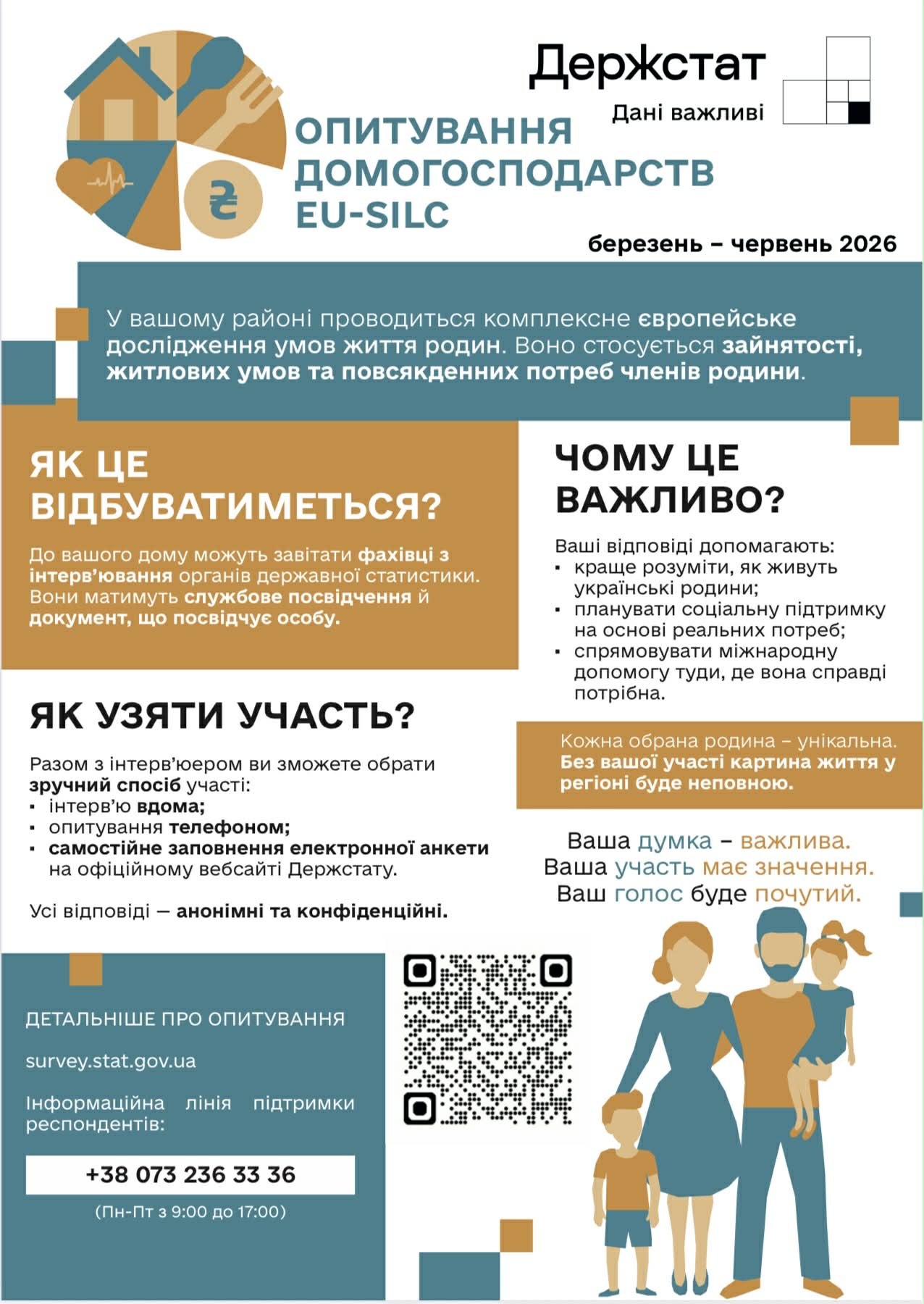 «Опитування населення проводяться в усіх країнах світу, адже без цих даних держава не може повноцінно розуміти, як живуть люди, і ухвалювати обґрунтовані рішення. Жодні адміністративні дані чи реєстри не дають повної картини – вони фіксують формальні показники, але не відповідають на питання, як живуть українські родини, з якими викликами стикаються та як оцінюють якість свого життя. Саме тому ми збираємо інформацію безпосередньо від людей.»