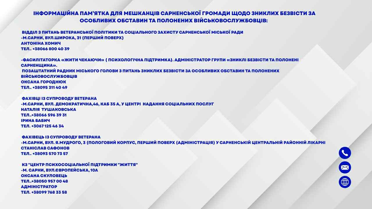 Сьогодні, 14:24, Адміністратор Надрукувати ІНФОРМАЦІЙНА ПАМʼЯТКА ДЛЯ МЕШКАНЦІВ САРНЕНСЬКОЇ ГРОМАДИ ЩОДО ЗНИКЛИХ БЕЗВІСТИ ЗА ОСОБЛИВИХ ОБСТАВИН ТА ПОЛОНЕНИХ ВІЙСЬКОВОСЛУЖБОВЦІВ